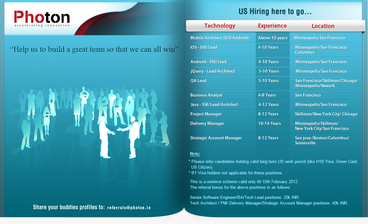 If any of your contacts would be interested in working with us, all you need to do is send us their resume/contact number to recruitment id and our recruiting department personal will get in touch with them at the earliest.